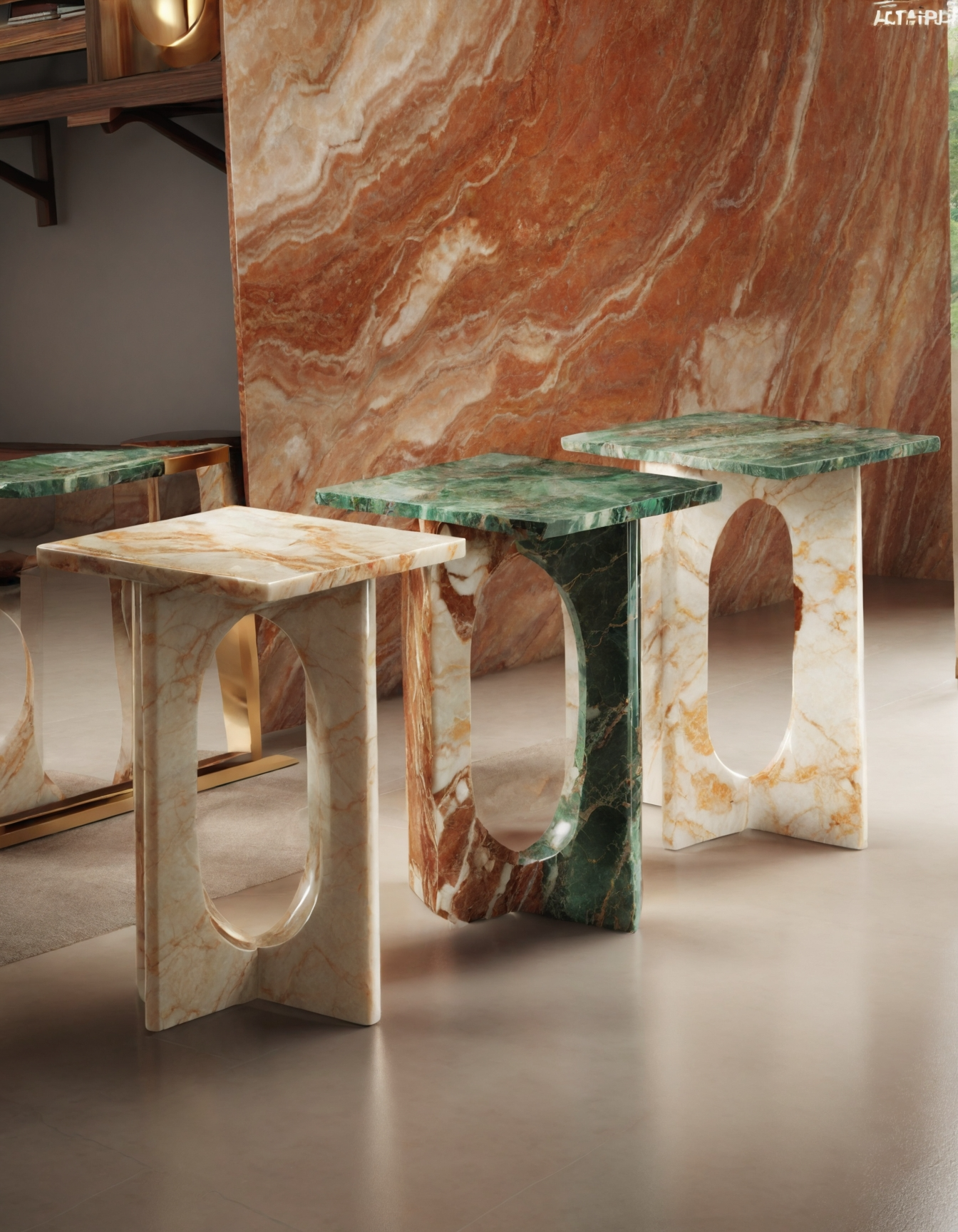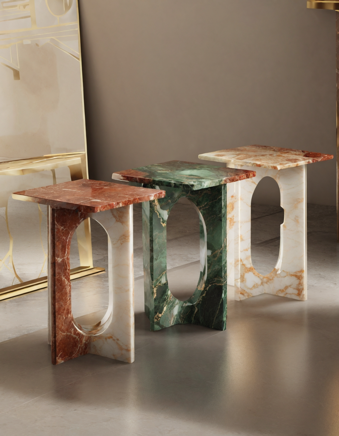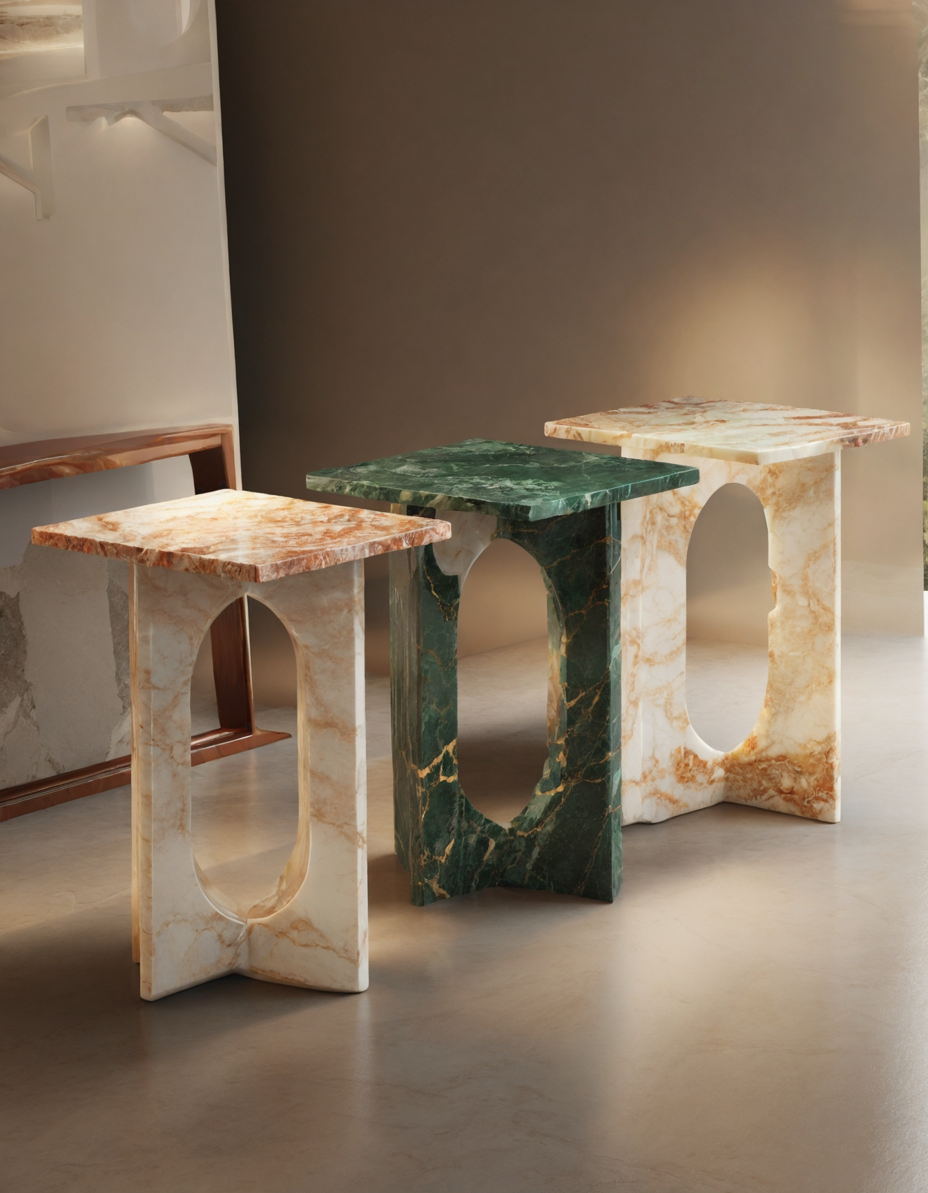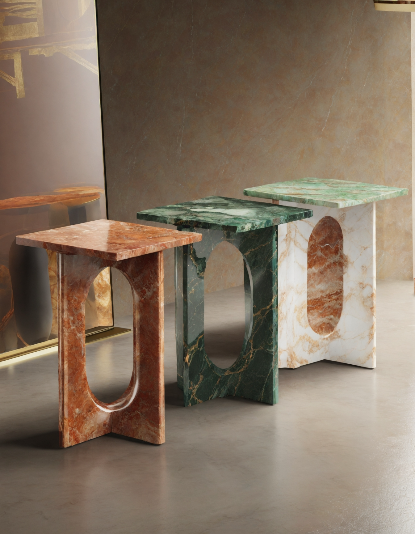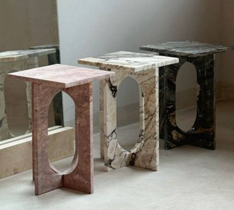 These marble side tables blend sculptural elegance with functional design. Featuring an oval cut-out, they come in pink, white, and black marbled finishes. Estimated height 45 Cm ; top length : 35 cm. Perfect as accent pieces in contemporary interiors.