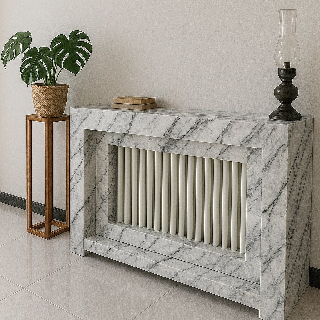 Elegant radiator cover with a green stone onyx and marble, combining beauty and functionality. It serves both as a radiator cover and as a luxurious console for books, plants, and decorative accessories.