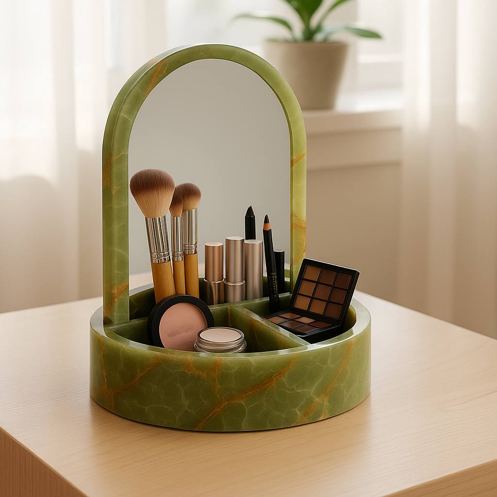 A practical tabletop organizer featuring a built-in round mirror and multiple compartments for storing everyday makeup and accessories. Designed to keep items neatly arranged and easy to access, it offers a clean and functional addition to any vanity or desk.