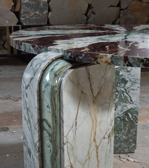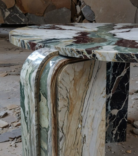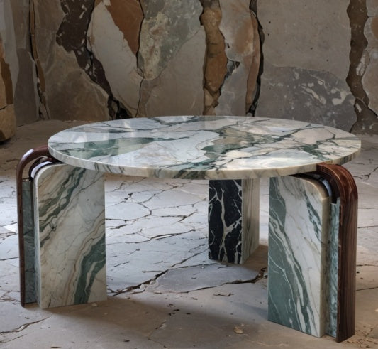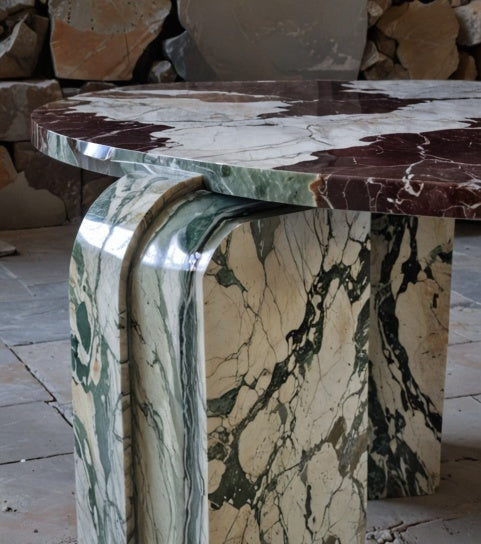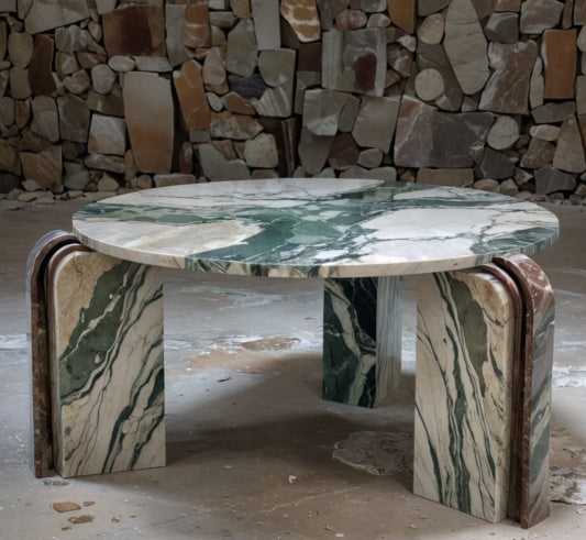 Handcrafted round onyx coffee table with polished multicolour legs. A modern, artistic piece perfect for living rooms or studios. Natural stone with unique veining and smooth finish